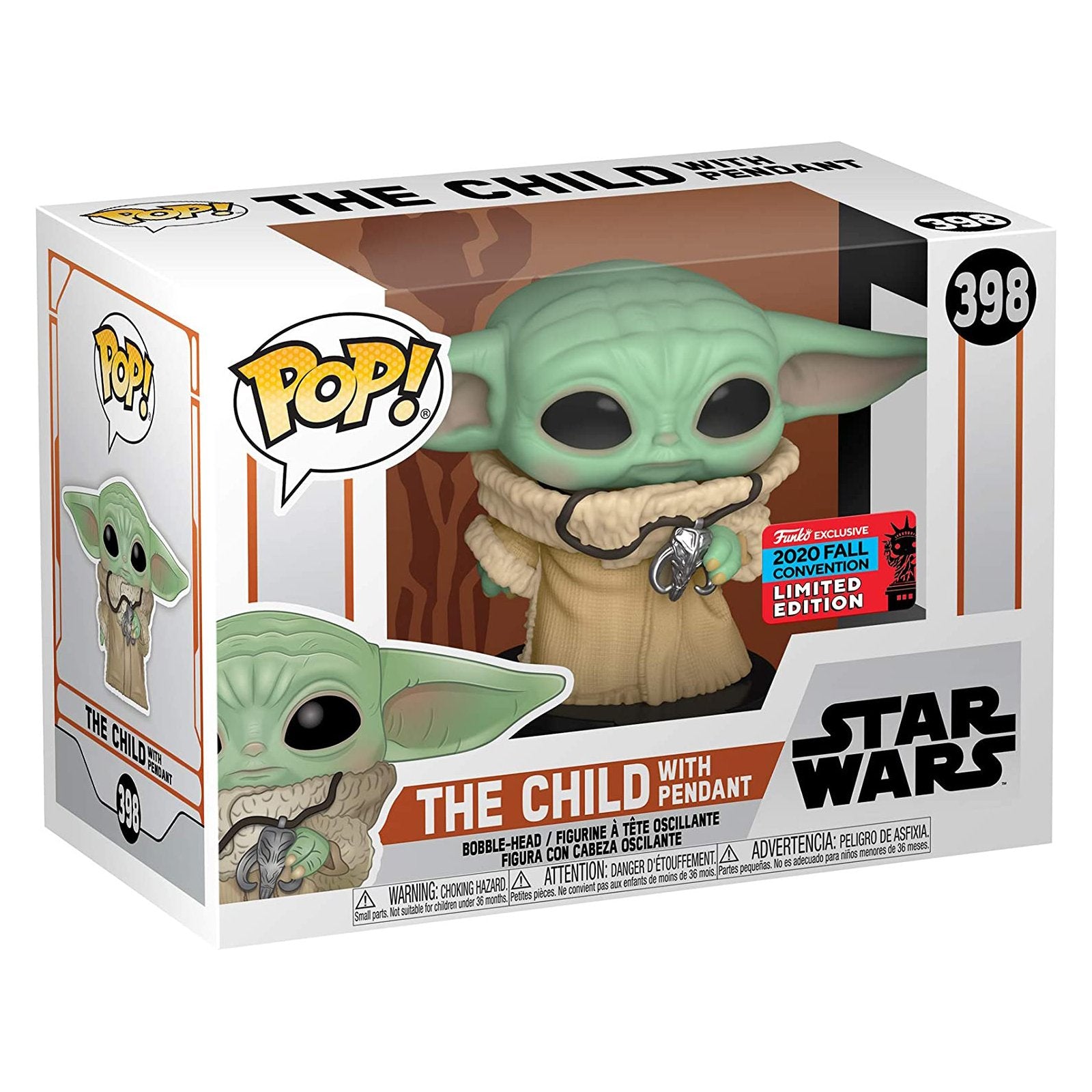 From the hit Disney+ show, The Mandalorian, The Child is known affectionately by fans as "Baby Yoda". This Star Wars The Mandalorian The Child with Necklace Fall Convention Exclusive Pop! Vinyl Figure features the beloved little alien enjoying a snack. It measures approximately 3 3/4-inches tall. Comes packaged in a window display box.